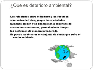 El documento resume los principales tipos de deterioro ambiental: la contaminación atmosférica por gases de fabricas y vehículos que dañan la capa de ozono, la contaminación del suelo por pesticidas y vertederos, y la contaminación por basura de las ciudades. Señala que el ser humano es el principal causante de este deterioro ambiental a través de sus acciones, y que debemos reflexionar sobre el daño que le causamos al planeta antes de que sea demasiado tarde.