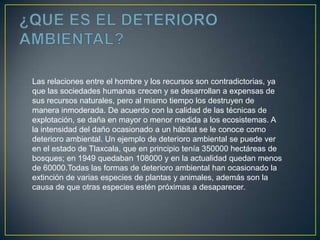 Las relaciones entre el hombre y los recursos naturales son contradictorias, ya que las sociedades humanas se desarrollan a expensas de los recursos pero también los destruyen de manera excesiva. El deterioro ambiental, como se ve en el estado de Tlaxcala que ha perdido la mayoría de sus bosques, ha ocasionado la extinción de muchas especies de plantas y animales.