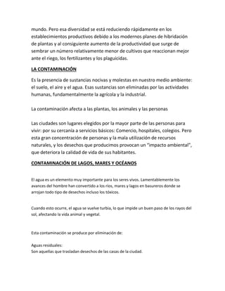 El documento describe los factores que contribuyen al deterioro ambiental como el agotamiento de recursos naturales como el agua, la contaminación producida por aguas residuales, residuos industriales y mineros, y petróleo. También explica cómo la contaminación del agua, suelo y aire afecta negativamente la salud humana y los ecosistemas.