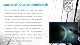 El documento aborda el deterioro ambiental, que incluye el aumento de gases tóxicos, la contaminación de suelos y aguas, y la extinción de especies, y señala que este fenómeno se ha acelerado en los últimos años. Se enfatiza la necesidad de cambiar el paradigma en la relación entre humanos y su entorno, así como la importancia de la educación ambiental y medidas individuales para mitigar el daño. También se mencionan iniciativas como el programa de la UNESCO y conferencias internacionales que buscan abordar estos problemas ambientales de manera conjunta.