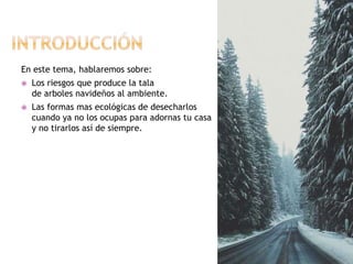 Este documento discute los riesgos ambientales de la tala de árboles navideños y formas más ecológicas de desecharlos. Explica que los árboles artificiales contaminan más que los naturales debido a los materiales plásticos y no son biodegradables. Recomienda optar por árboles naturales locales de vivero en lugar de bosques, y desecharlos adecuadamente en puntos limpios o usándolos como leña una vez terminadas las fiestas.