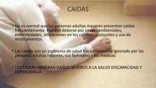 El documento describe varios programas y estrategias para prevenir el deterioro cognitivo en adultos mayores, incluyendo la prevención de caídas, el diagnóstico y tratamiento de la depresión, y la evaluación de alteraciones de la memoria. Se enfatiza la importancia de identificar y tratar estos problemas para mantener la salud y funcionalidad de las personas de edad avanzada.