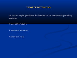 1) El documento describe los principales tipos de deterioro que pueden afectar las conservas de pescado y mariscos, incluyendo alteraciones químicas, bacterianas y físicas.