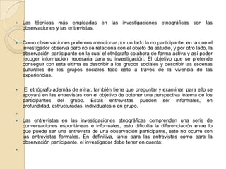 El documento describe las técnicas más empleadas en las investigaciones etnográficas, que son las observaciones y las entrevistas. Se mencionan la observación no participante y la observación participante, así como las entrevistas informales, en profundidad y estructuradas. También señala que el investigador debe considerar el contexto, los efectos que cause en el grupo, la necesidad de crear comunicación y relaciones con los miembros del grupo. Otra técnica es la recopilación de documentos como diarios, autobiografías y estudios publicados previos