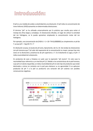 El documento aborda la importancia de la determinación del pH en el laboratorio clínico, destacando su relación con la manifestación de patologías y métodos para medirlo, como potenciómetros e indicadores. Se explican las características del pH, su escala, y la necesidad de calibrar adecuadamente los instrumentos de medición para obtener resultados precisos. Además, se presentan resultados de análisis de pH de diversas muestras y la eficacia del bicarbonato como antiácido.
