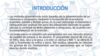 El documento detalla la práctica de laboratorio #6 sobre la determinación gravimétrica de calcio mediante la formación de oxalato de calcio a partir de soluciones alcalinas. Se presenta el procedimiento, cálculos y resultados de la cuantificación del contenido de calcio en muestras diversas, indicando que la leche es una fuente rica en este mineral. Los resultados obtenidos fueron 0.145 g/100 ml y 0.127 g/100 ml de calcio en las muestras analizadas.