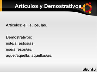Los determinantes acompañan a los sustantivos y pueden ser artículos, demostrativos, posesivos, numerales, indefinidos, interrogativos o exclamativos. Los determinantes varían en género (masculino o femenino) y número (singular o plural). Los artículos incluyen el, la, los y las. Los demostrativos son este/a, estos/as, ese/a, esos/as, aquel/aquella y aquellos/as. Los posesivos indican posesión por un solo poseedor o varios poseedores.