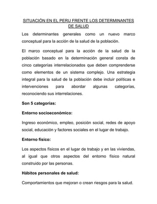 El documento describe los determinantes sociales de la salud y cómo están cambiando para mejorar el bienestar de la población en el Perú. Explica que existen cinco categorías interrelacionadas de determinantes: entorno socioeconómico, entorno físico, hábitos de salud personal, capacidad y actitudes individuales, y servicios de salud. El enfoque busca mejorar la salud de la población mediante políticas e intervenciones en estas categorías y sus interrelaciones, con un énfasis en hábitos saludables, nutrición, des