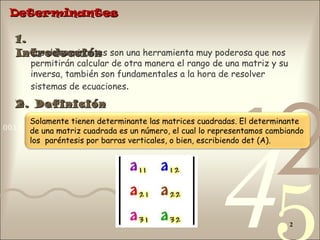 El documento explica los determinantes de matrices cuadradas de diferentes órdenes. Define que un determinante es un número asociado a una matriz cuadrada que depende de su orden. Explica que el determinante de orden 1 es el elemento de la matriz, el de orden 2 es el producto de la diagonal principal menos la secundaria, y el de orden 3 se calcula mediante la regla de Sarrus copiando columnas.