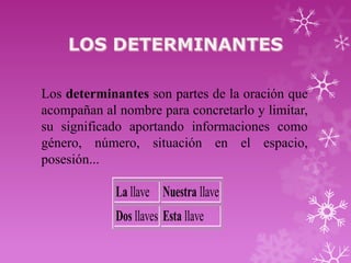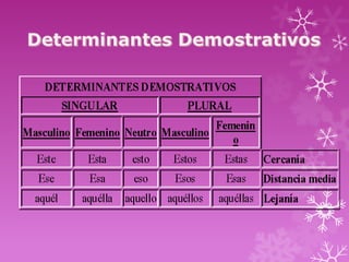 Este documento explica los diferentes tipos de determinantes en español, incluyendo artículos, demostrativos, posesivos, numerales, indefinidos, interrogativos y exclamativos. Define cada tipo de determinante, sus formas y usos para acompañar a los nombres y concretar su significado.