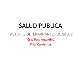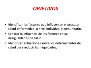 Este documento describe los principales factores determinantes de la salud según varios modelos. Identifica factores como el estilo de vida, el medio ambiente, la biología humana y el sistema de salud como influyentes en el estado de salud de las personas y las poblaciones. Destaca la importancia de los determinantes sociales de la salud, como la pobreza y el nivel educativo, que tienen un gran impacto en las desigualdades de salud entre grupos.