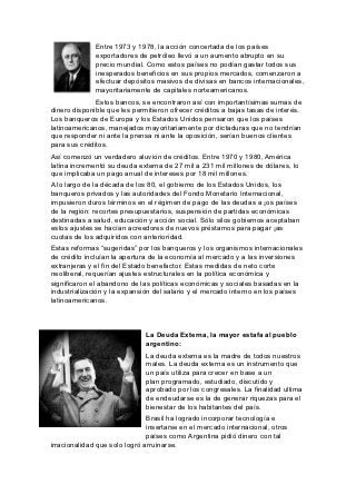 Este documento resume la historia de la deuda externa argentina. Comienza en la década de 1970 cuando los bancos internacionales ofrecieron grandes préstamos a bajas tasas de interés a los países latinoamericanos, incluida Argentina. Para 1980, la deuda externa argentina había aumentado de $27 mil millones a $231 mil millones. En la década de 1980, el FMI impuso estrictas medidas de ajuste estructural que afectaron negativamente a la economía y sociedad argentinas. Finalmente, antes de de