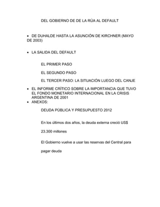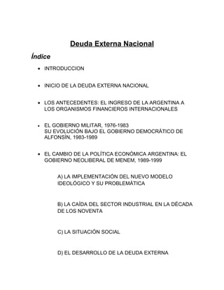 1) En la década de 1820, funcionarios argentinos como Manuel García y Bernardino Rivadavia autorizaron un préstamo de un millón de libras esterlinas de Inglaterra para el desarrollo de infraestructura, aunque en realidad respondió a intereses geopolíticos británicos. 2) Este préstamo marcó el inicio de la deuda externa argentina. 3) Años más tarde, la deuda no pudo ser pagada y llevó a conflictos y cesiones territoriales con Gran Bretaña.