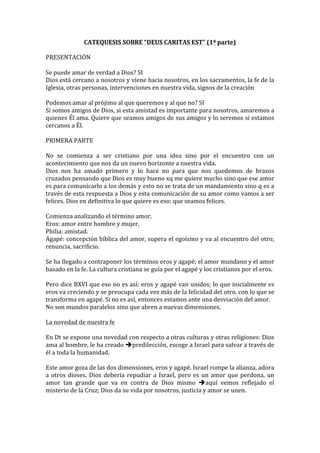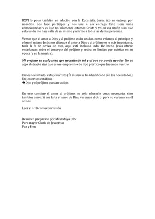Este documento presenta una catequesis sobre el amor de Dios y el prójimo. Explica que el amor de Dios nos motiva a amar a los demás, ya que Dios ama a toda la humanidad. Además, describe las diferentes formas de amor (eros, philia, agapé) y cómo el amor cristiano las integra. Finalmente, enfatiza que al amar y servir a los necesitados, amamos a Dios, porque Jesús se identificó con ellos.