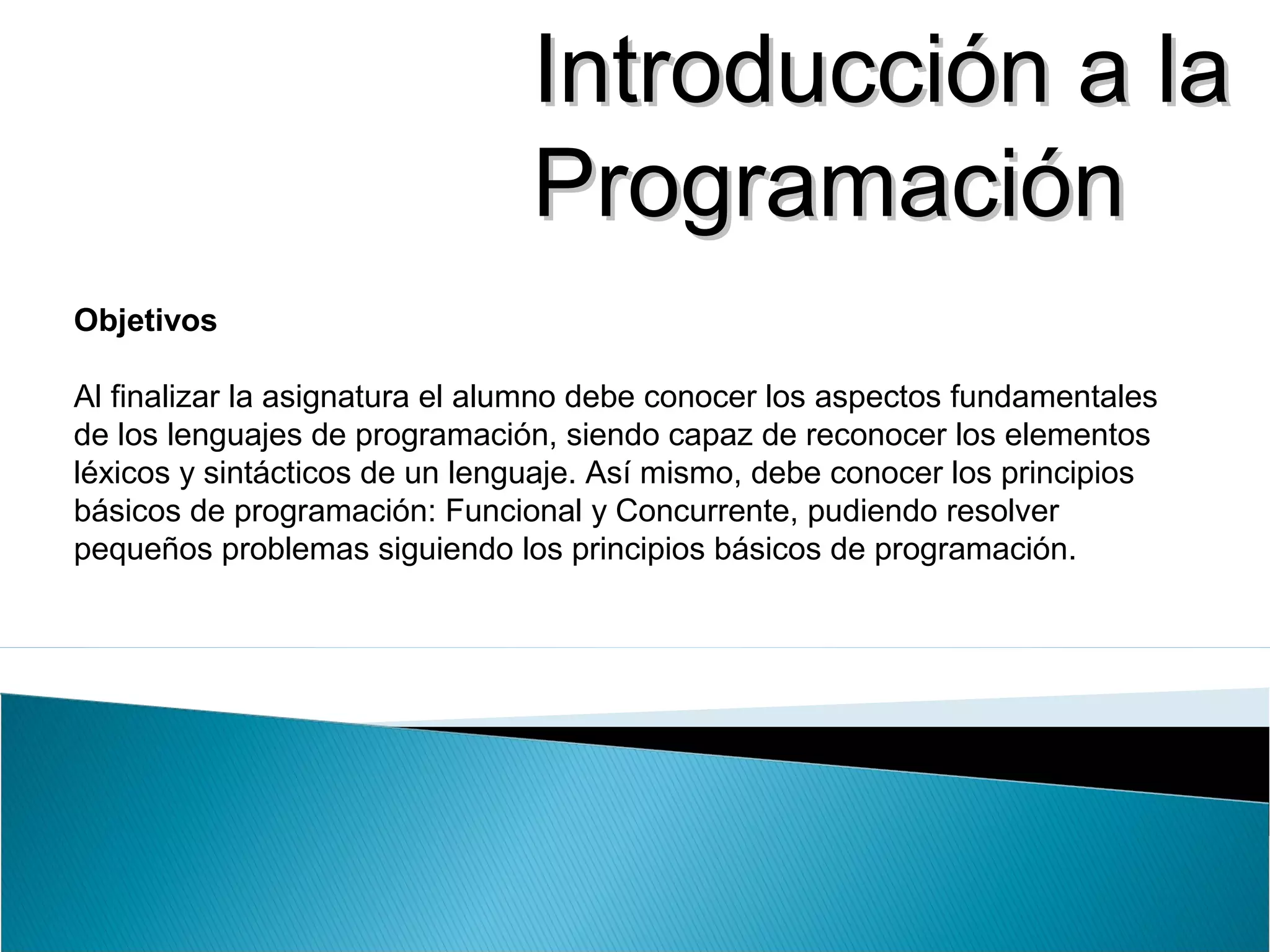 Introducción a laIntroduccióna la ProgramaciónProgramación Objetivos Al finalizar la asignatura el alumno debe conocer los aspectos fundamentales de los lenguajes de programación, siendo capaz de reconocer los elementos léxicos y sintácticos de un lenguaje. Así mismo, debe conocer los principios básicos de programación: Funcional y Concurrente, pudiendo resolver pequeños problemas siguiendo los principios básicos de programación.
