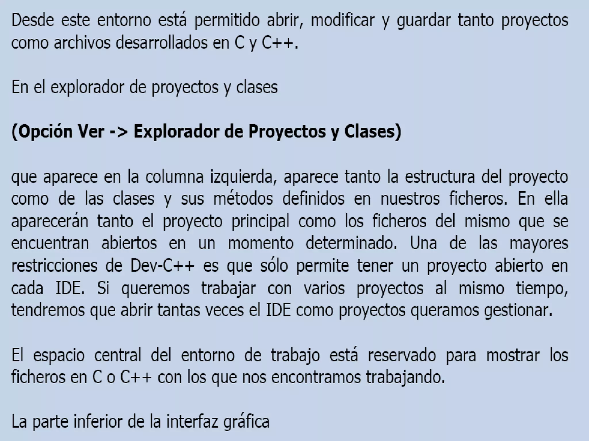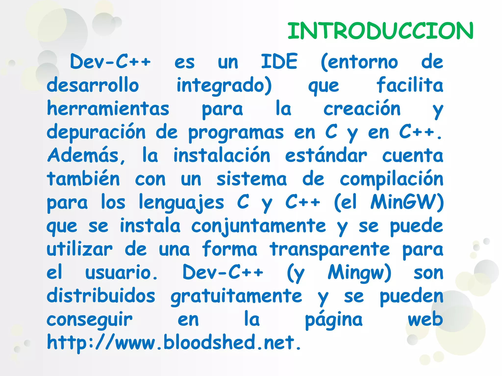 Dev-C++ es un IDE gratuito que facilita herramientas para crear y depurar programas en C y C++. Incluye un compilador MinGW y ofrece funcionalidades como resaltado de sintaxis, depuración, generación de instaladores, bibliotecas y archivos de ejemplo. Se puede descargar gratis de bloodshed.net.