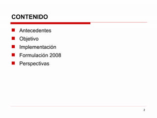 Este documento describe los planes del Ministerio de Economía y Finanzas para implementar un presupuesto basado en resultados en el año 2008. Esto incluye priorizar programas que preserven el capital humano, especialmente en educación y nutrición, y desarrollar infraestructura local básica. El objetivo es fortalecer la eficacia del gasto público para mejorar el bienestar de la población y reducir la pobreza. Se propone una programación presupuestaria estratégica que planifique de manera multianual y multisectorial,