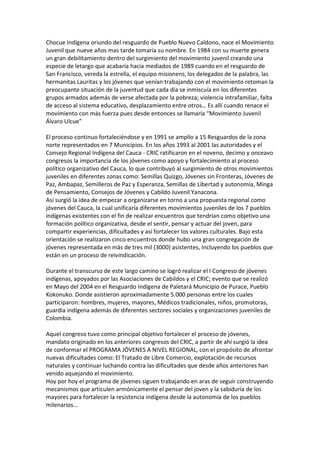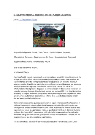 Este documento describe el IV Encuentro Regional de Jóvenes del Consejo Regional Indígena del Cauca (CRIC) y de Pueblos Milenarios que se llevará a cabo del 22 al 25 de noviembre de 2012 en el Resguardo Indígena de Puracé, Cauca, Colombia. El encuentro busca fortalecer el proceso organizativo de los jóvenes indígenas a través de discusiones, actividades culturales y rituales. Se espera la asistencia de delegaciones de varios pueblos indígenas
