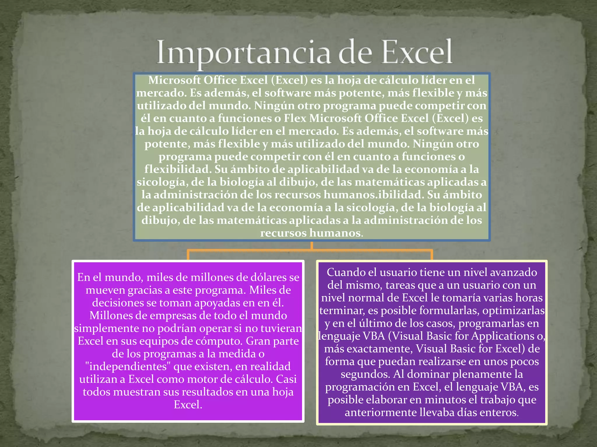 Excel es un programa de hoja de cálculo líder en el mercado que es muy potente, flexible y utilizado en todo el mundo. Se puede usar en muchas áreas como economía, biología, matemáticas y administración. Miles de millones de dólares y decisiones dependen de Excel, y muchas empresas no podrían operar sin él. Los contadores y auditores pueden sacar provecho de sus funciones para optimizar su trabajo.