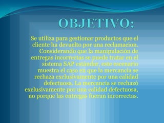 Este documento describe el proceso de devolución de mercancías cuando la mercancía ha sido rechazada debido a una calidad defectuosa. Explica que la mercancía devuelta primero se inspecciona en un laboratorio o fábrica y luego el proveedor o fabricante decide el estado de la mercancía y si se cobrará al cliente. También presenta las funciones del flujo de procesos de devolución, que incluye crear una orden de devolución, generar una entrada de mercancía, crear un abono para el cliente, anal