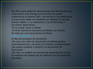 Este documento trata sobre la gestión de devoluciones de mercancías en el sistema SAP. Explica que las devoluciones se utilizan para devolver productos al proveedor si la entrega fue incorrecta o defectuosa. El sistema SAP genera automáticamente una orden de devolución y ajusta el stock correspondiente. También permite visualizar e imprimir documentos de facturación y analizar los productos devueltos para determinar cómo se manejarán.