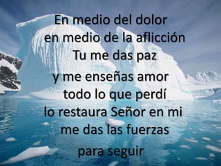 Este poema habla sobre cómo Dios da paz y amor en medio del dolor y la aflicción, restaurando lo perdido y dando fuerzas para seguir. El autor expresa su necesidad de Dios para recibir gozo, sustento espiritual y un nuevo corazón.