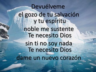 Este poema habla sobre cómo Dios da paz y amor en medio del dolor y la aflicción, restaurando lo que se ha perdido y dando fuerzas para seguir adelante. El autor expresa su necesidad de Dios para recuperar el gozo de la salvación y ser sustentado por su espíritu noble, necesitándolo para tener un nuevo corazón.