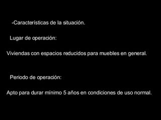 Este documento describe el diseño de un mueble desayunador para espacios pequeños. Presenta las características del proyecto, que incluyen un mueble económico, de fácil instalación y funcional para viviendas con poco espacio. Detalla los requisitos como ser funcional y estético para usuarios de 20 a 50 años. Finalmente, incluye encuestas sobre el precio apropiado y la importancia de este mueble.