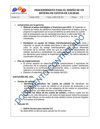 Este documento describe los pasos para diseñar un sistema de costos de calidad en una empresa de producción de embutidos. Primero, se debe obtener el compromiso de la gerencia y formar un equipo interdisciplinario. Luego, se identifican y clasifican los costos de calidad, se calculan usando técnicas como partidas contables, y se realiza un seguimiento a través del análisis de datos e informes para tomar acciones de mejora.