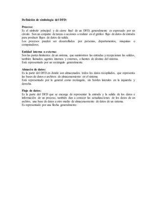 El Diagrama de Flujo de Datos (DFD) es una representación gráfica que muestra los procesos, flujos de información y almacenamiento de datos dentro de un sistema. Existen tres niveles de DFD: contexto, superior y detalle, cada uno con diferentes grados de complejidad y detalle. Los símbolos utilizados en un DFD, como procesos, entidades y flujos de datos, ayudan a entender la interrelación entre componentes del sistema.