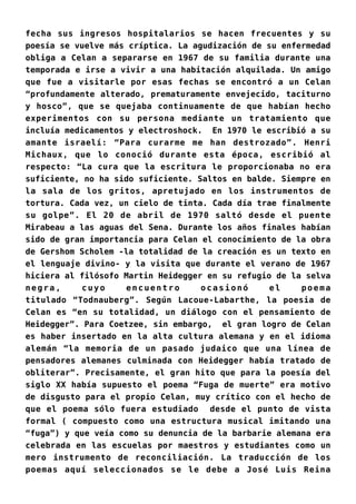 Paul Celan, nacido en 1920 en Czernowitz, atraviesa una vida marcada por la tragedia, incluyendo la pérdida de sus padres durante el Holocausto, lo cual influye profundamente en su poesía. A pesar de su éxito y reconocimiento, su vida estuvo plagada de problemas de salud mental y crisis personales, culminando en su suicidio en 1970. Su obra es valorada por su complejidad y su capacidad de dialogar con el pensamiento filosófico, destacando la memoria judía y su crítica a la barbarie alemana.