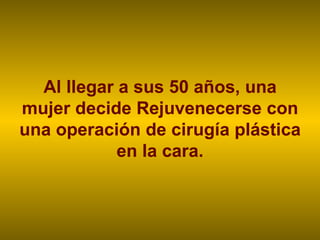 Una mujer de 50 años se somete a una cirugía plástica para rejuvenecerse y le pregunta a varias personas cuántos años creen que tiene, obteniendo respuestas de entre 29 y 32 años. Finalmente, le hace la misma pregunta a un anciano, quien le pide tocar sus pechos para adivinar su edad exacta. Después de varios minutos, él le dice que tiene 50 años. Cuando ella le pregunta cómo lo supo, él revela que la había visto antes en la fila de McDonald's.