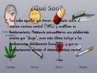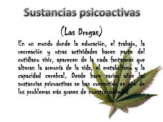 Este documento describe las diferentes clases de sustancias psicoactivas o drogas, incluyendo depresores como el alcohol y los narcóticos, estimulantes como la cocaína y las anfetaminas, alucinógenos como el LSD y los hongos mágicos, y sustancias mixtas como la marihuana y el éxtasis. Explica que el consumo habitual de estas sustancias altera el funcionamiento del cuerpo, el estado de ánimo y la conducta de las personas.