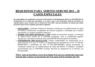 El documento lista los requisitos para postular al sorteo ordinario de plazas SERUMS 2011-II, que incluyen inscribirse en la página web del MINSA, entregar la ficha de inscripción impresa junto con documentos como título profesional, colegiatura, DNI y certificados médicos. También describe casos especiales como gestantes o madres con hijos menores de un año que requieren documentos adicionales.