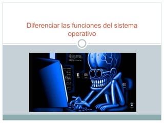El documento describe las funciones y características de los sistemas operativos. Explica que los sistemas operativos administran los recursos hardware como procesadores, memoria y dispositivos de entrada/salida y actúan como intermediarios entre el software y hardware. También cubre los tipos de recursos que administra un sistema operativo como trabajos, memoria, entrada/salida y la asignación de servicios para programas.