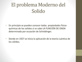 El documento describe la importancia del estudio de sólidos en la tecnología moderna, incluyendo determinar la estabilidad volumétrica y propiedades de superficies, predecir nuevos materiales y propiedades electrónicas. También discute los desafíos teóricos como resolver la ecuación de Schrödinger para sistemas de muchos electrones, y cómo la teoría funcional de la densidad (DFT) puede reemplazar este problema por uno de una sola partícula. Finalmente, presenta una justificación para realizar un estudio