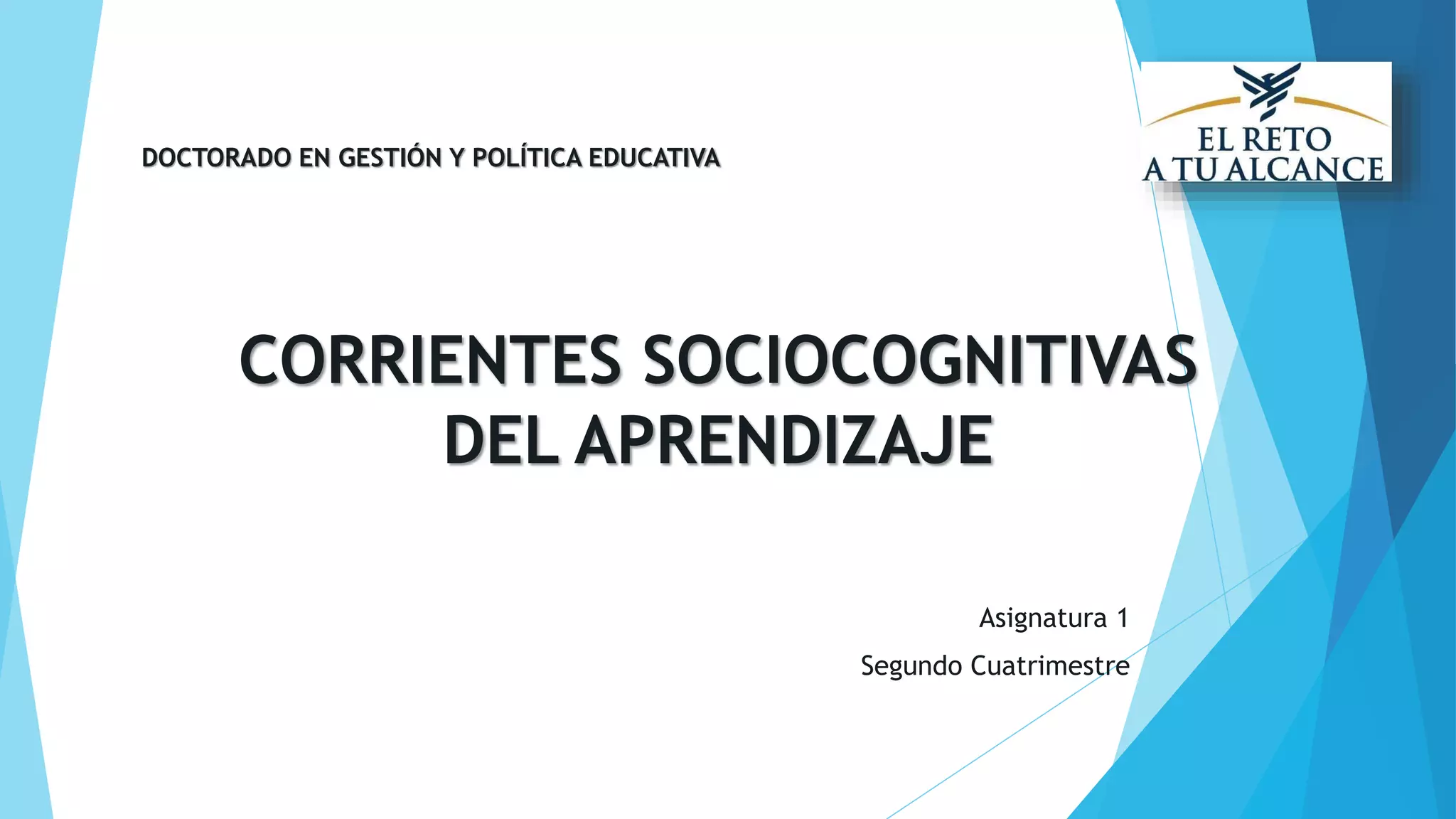Este documento presenta la asignatura "Corrientes sociocognitivas del aprendizaje" que forma parte del Doctorado en Gestión y Política Educativa. La asignatura busca que los estudiantes conozcan las diferentes teorías sobre el aprendizaje desde las perspectivas sociológica y psicológica, y analicen los factores que influyen en el proceso de aprendizaje. Se dividirá en 7 unidades temáticas y incluirá actividades como ensayos y análisis crítico comparativo de lecturas.