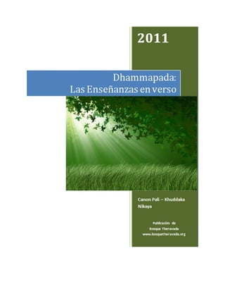 El documento presenta una introducción al Dhammapada, una antología de 423 versos que es reconocida como una obra maestra de la literatura budista temprana. Se divide el Dhammapada en 26 capítulos que contienen las enseñanzas del Buda. El documento incluye la tabla de contenidos con los nombres de los capítulos y los versos que contiene cada uno. Finalmente, se especifica que la obra tiene una licencia Creative Commons que permite su copia y distribución siempre que se cite la fuente.
