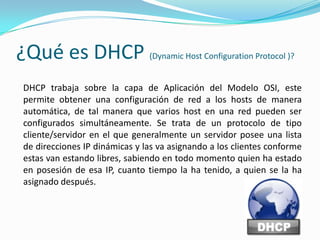DHCP es un protocolo que permite la asignación automática de direcciones IP a dispositivos de red de forma dinámica u estática. Un servidor DHCP posee una lista de direcciones IP disponibles y las asigna a clientes cuando las solicitan, manteniendo un registro de qué cliente tiene asignada cada IP y por cuánto tiempo. Los clientes y servidores intercambian una serie de mensajes DHCP para solicitar, ofrecer, aceptar o renovar las configuraciones de red.