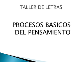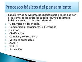 El documento describe nueve procesos básicos del pensamiento, incluyendo la observación, comparación, relación, clasificación, cambios y consecuencias, variables ordenables, análisis, síntesis y evaluación. Se enfoca en la observación, comparación, relación y clasificación, explicando que la observación implica identificar características directa e indirectamente y que la comparación identifica diferencias entre objetos usando variables específicas.