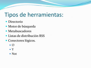 El documento describe varias herramientas de búsqueda de información como directorios, motores de búsqueda, metabuscadores, listas RSS y conectores lógicos. También explica conceptos como intitle, site, author y proporciona consejos para realizar búsquedas más efectivas como ser más específico, usar comillas y pensar críticamente sobre la calidad y fuentes de información.