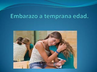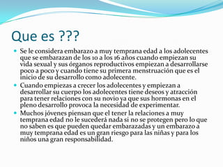 El documento describe las consecuencias del embarazo a temprana edad entre adolescentes. Esto incluye riesgos para la salud como complicaciones durante el parto que pueden ser mortales, así como consecuencias sociales como dejar la escuela y problemas familiares como el rechazo de los padres. La prevención requiere educación sobre anticonceptivos y sexualidad en el hogar y la escuela.