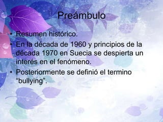 Este documento describe el fenómeno del acoso escolar o "bullying". Explica que el término surgió en la década de 1960 en Suecia y define el bullying como agresiones verbales, físicas o sociales contra una víctima. Detalla los tipos de agresiones y perfiles de víctimas. También cubre las consecuencias del bullying y estadísticas sobre suicidios relacionados. Por último, analiza el papel de los espectadores, padres, profesores, autoridades y la necesidad de concientizar a todos los sect