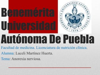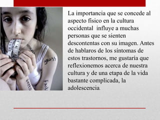 Este documento trata sobre la anorexia nerviosa. Explica que la presión por ser delgado influye en muchos adolescentes y los hace vulnerables a este trastorno. Define la anorexia nerviosa como un desorden psicológico y alimenticio en el que el control del peso se convierte en un símbolo de poder. Las causas incluyen las altas demandas de la familia y la sociedad por ser delgado y atractivo, lo que lleva a una baja autoestima.