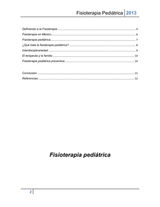 El ensayo explora la fisioterapia pediátrica, destacando su importancia en el desarrollo y rehabilitación de niños a través de intervenciones especializadas, promoviendo su autonomía y bienestar. Se discuten las necesidades de formación especializada en México, la interdisciplinariedad en el equipo terapéutico y la relación fundamental entre terapeutas y familias. Además, se aboga por la investigación y la prevención como partes esenciales de esta disciplina para mejorar la salud infantil.