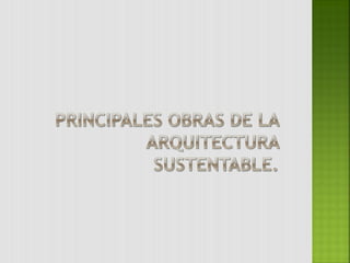 Este documento es un ensayo de un grupo de estudiantes de arquitectura sobre la arquitectura sustentable. Explica la definición de arquitectura sustentable según las Naciones Unidas y destaca algunos de sus beneficios ambientales y económicos. También presenta ejemplos como la biblioteca de la Universidad de Lovaina y el edificio de la sede central de Siemens en Munich, así como al arquitecto Georg Reinberg, uno de los principales promotores de la arquitectura solar.