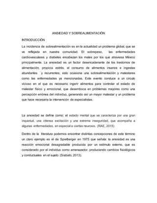 El documento discute la relación entre la ansiedad y la sobrealimentación. Explica que la ansiedad es un factor que desencadena trastornos alimenticios y lleva a ingestas abundantes que causan sobrealimentación y problemas de salud. La sobrealimentación induce un círculo vicioso donde las personas comen en exceso para controlar su malestar físico y emocional, lo que empeora su percepción y salud.