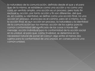 Este documento define la comunicación como una acción entre sujetos para lograr un significado común a través de un mensaje. La comunicación tiene como propósito establecer una unidad entre dos o más sujetos mediante la conformidad de sus acciones. El documento también describe los elementos clave del proceso de comunicación como el emisor, receptor, mensaje, canal, código y contexto.