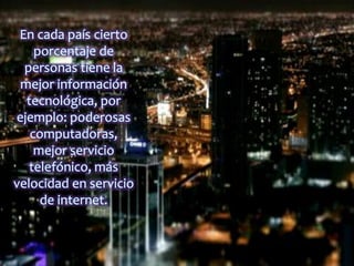 Este documento resume la situación de los usuarios de Internet a nivel mundial en noviembre de 2000. Reporta que había 407.1 millones de usuarios en total, con América Latina teniendo 16.45 millones de usuarios. Sin embargo, el acceso a Internet estaba desigualmente distribuido, con solo el 6% de la población en Brasil y el 3% en Argentina y México teniendo acceso regular. A pesar del rápido crecimiento del uso de Internet en América Latina, la desigualdad económica estaba limitando su alcance.