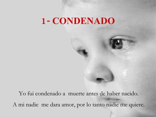 El documento aborda la lucha interior de un feto que se siente condenado a muerte antes de nacer, expresando su dolor y deseo de vida frente a la posibilidad del aborto. A través de analogías con la pasión de Cristo, se plantea la injusticia de ser considerado indeseado y el sufrimiento que esto conlleva. El mensaje central aboga por la pro vida, citando a Jeremías para enfatizar el valor de la vida desde la concepción.